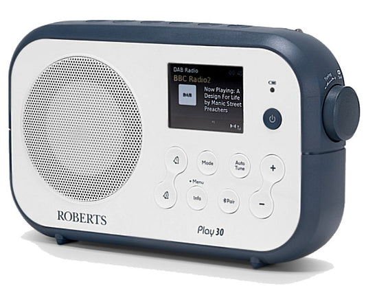 Roberts Play 30 Portable Radio – DAB+/FM, Bluetooth Speaker & Alarm in Stylish White and Blue